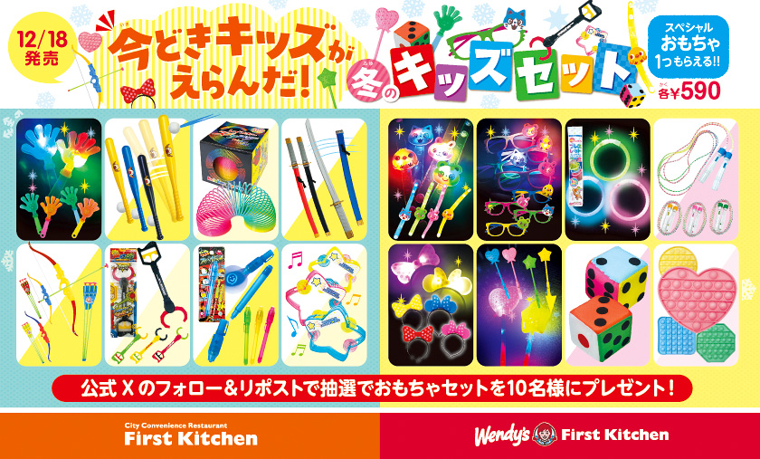 - 12月18日(水)から、ウェンディーズ・ ファーストキッチンとファーストキッチンの対象店舗で、スペシャルキッズセットを販売します。今冬は、今どきキッズたちが選んだ、リアルに欲しいと思えるおもちゃがラインナップ!大人気ピカピカ光るシリーズや、身に着けて楽しめるおもちゃなどを取り揃えました。冬のわくわくはウェンディーズとファーストキッチンにお任せ!数に限りがありますので、お早めにご来店ください。また、12月17日(火)〜1月5日(日)の期間中、ファーストキッチンの公式X(旧Twitter)アカウント(@FK_PR)をフォローし、対象ポストをリポストいただくと抽選で10名様に、スペシャルおもちゃセット(全16種)をプレゼントいたします。ぜひご参加ください!
