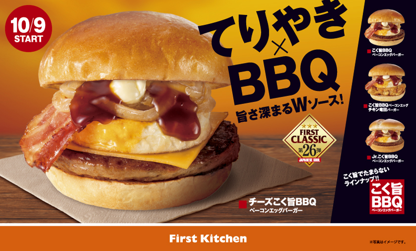 - 10月9日(木)から、ファーストキッチン(競馬場店を除く)にて、ファーストキッチンの看板商品「ベーコンエッグバーガー」を秋らしい味わいにアレンジしたバーガー4品を発売します。ベーコンエッグバーガーは創業当時よりこれまで48年間親しまれてきた歴史ある商品で、プルプルなたまごは店内で一つひとつ丁寧に焼き上げています。今回は隠し味に八丁味噌を使用したオリジナルこく旨てりやきソースとBBQソースのWソースで、よりコク深い味わいに仕立てました。グリルオニオンの旨みがぎゅっと詰まった、何度でも食べたくなる味わいが食欲の秋にぴったりな、季節限定バーガーをお楽しみください。