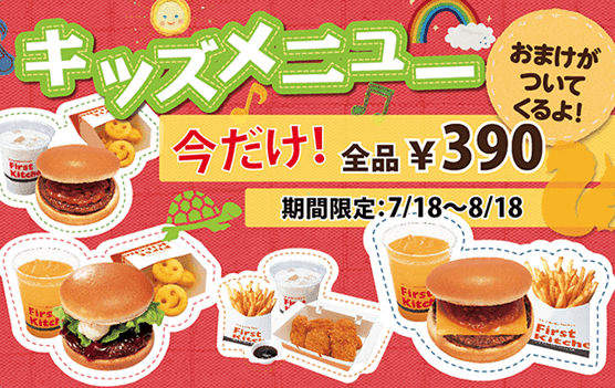 ファーストキッチンでは、お子様にも美味しく食べやすいキッズセットをおもちゃ付きでご用意してお ります。今回は、ハンバーガー・チーズバーガーのソースをデミグラスソースからお子様に人気のミ ートソースにリニューアルし、全 4 種類の「キッズセット」を販売いたします。 また、キッズメニューリニューアルに合わせ期間限定で全セットを特別価格 390 円で販売いたします。