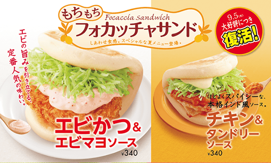 7月にご好評頂きました「エビかつ&エビマヨソース」「チキン&タンドリーソース」を2013年9月5日(木)より再販売致します。こちらの商品はオリジナルフォカッチャを使用しています。こだわりは“もちもちの食感”。たんぱく質とミネラルを多く含む小麦を使用し、水分が飛ばないように短時間で焼き上げ“しっとり、もっちり”と仕上げました。具材には、より豊かな食感の組み合わせが楽しめるプリプリのエビかつ、ジューシーなチキンをサンド、この夏限定の美味しさを是非ご賞味ください。