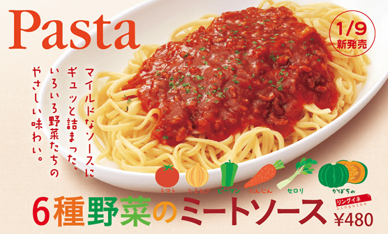 201401.08 6種野菜のミートソース新発売! 〜みんな大好きミートソース〜 2014年1月9日(木)より「6種野菜のミートソース」 をショッピングセンター店舗限定で販売します。 ☆6種野菜のミートソース☆ 牛・豚の合い挽き肉とトマト・たまねぎ・ピーマン・にんじん・セロリ・かぼちゃの6種類の野菜をじっくり煮込みました。肉と野菜の旨味がギュッと詰まったマイルドなミートソースです。 ・単品 480円 ・ドリンクセット 630円 ・ポテトドリンクセット 840円 人気商品「チキン竜田サンド」復活!... チキンときのこのポルチーニクリーム新発売...