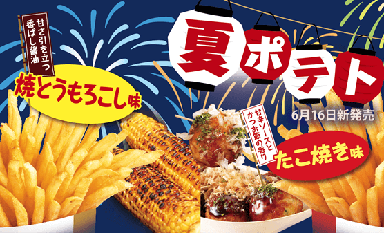 - 2016年6月16日(木)より、『たこ焼き味ポテト』『焼とうもろこし味ポテト』の新味2種を販売いたします。ファーストキッチンの看板商品のひとつとなったフレーバーポテトは現在、7種類のラインナップを取り揃え、ポテトバリエーションの豊富さをお楽しみいただいております。第1作目の「バジルポテト」(1996年発売)から数えて、通算87作目となる今回の商品は、日本の美味しさをギュッと閉じ込めたフレーバーポテトです。夏のイベントであるお祭りで人気のたこ焼きと焼とうもろこしをイメージしたポテト2種類をお楽しみください。