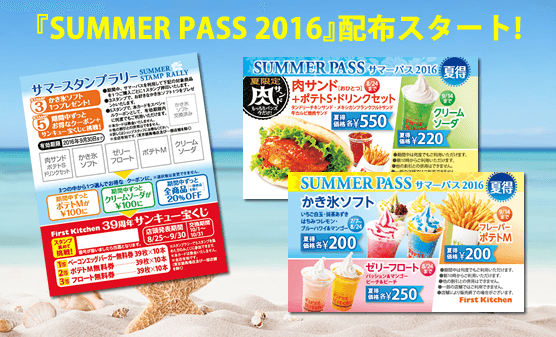 - 期間限定で、商品をご購入いただいたお客様にスタンプラリー、39周年サンキュー宝くじがついた『SUMMER PASS 2016』をお渡しいたします。人気商品や新商品のクーポンがついておりますので、ぜひご利用ください。