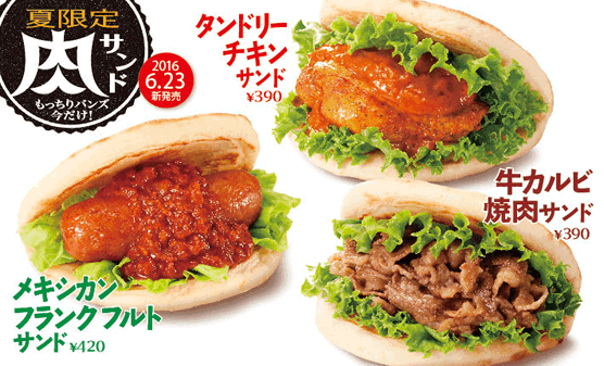 - 2016年6月23日(木)より、『タンドリーチキンサンド』『メキシカンフランクフルトサンド』『牛カルビ焼肉サンド』 を発売致します。暑い夏を乗り切るのにぴったりな夏限定の肉サンド3種類を是非お楽しみください。