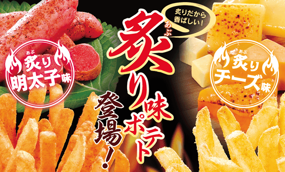 - 2016年9月15日(木)より、『炙り明太子味ポテト』 『炙りチーズ味ポテト』の新味2種を販売いたします。ファーストキッチンの看板商品のひとつとなったフレーバーポテトは現在、7種類のラインナップを取り揃え、ポテトバリエーションの豊富さをお楽しみいただいております。第1作目の「バジルポテト」(1996年発売)から数えて、通算91・92作目となる今回の商品は、定番の明太子味とチーズ味を炙ることによってより旨みを引き立たせたポテトです。