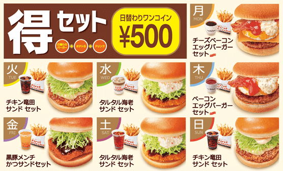 - 毎日個性豊かなハンバーガーセットを500円で楽しもう!