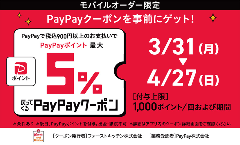 - 3月31日(月)から、ウェンディーズ・ ファーストキッチンとファーストキッチンの対象店舗で、モバイルオーダーにて「PayPay」を利用すると最大5%のPayPayポイントを付与するクーポンキャンペーンを実施します。